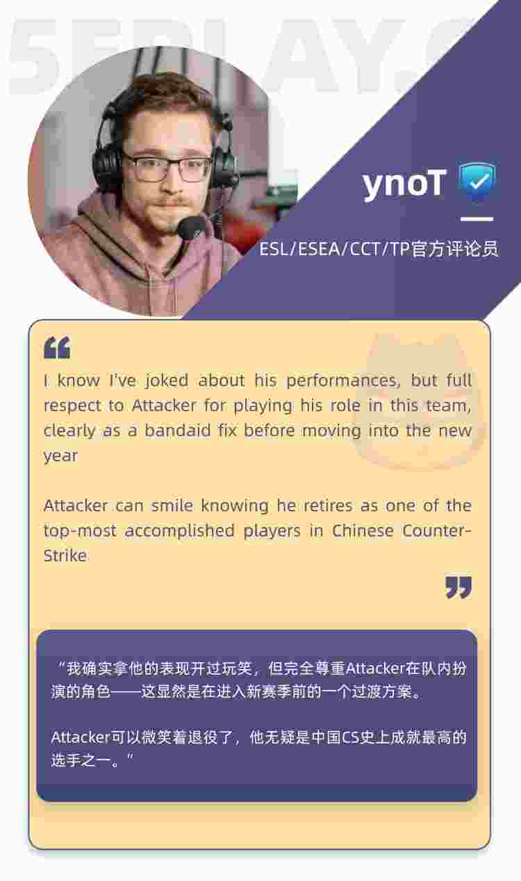 Attacker选手退役并进入教练组的消息,此消息在国内外媒体平台都引起了业内关注。来自ESL/ESEA/CCT等各大赛事的官方美国评论员ynoT在TYLOO官推下方向老将Attacker致敬:“我确实拿他的表现开过玩笑,但完全尊重Attacker在队内扮演的角色——这显然是在进入新赛季前的一个过渡方案。Attacker可以微笑着退役了,他无疑是中国CS史上成就最高的选手之一。”