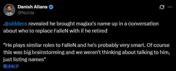 magixx在他看来可能是FalleN的完美替代者,sidde表示:“Magixx在场上的角色和FalleN很相似,而且他打得很聪明。当然,这只是我们私下针对这种情况作出的一些讨论,我们并没有打算真的和他聊这个计划,只是列出了一些可能的选项(其中包含Magixx)。”