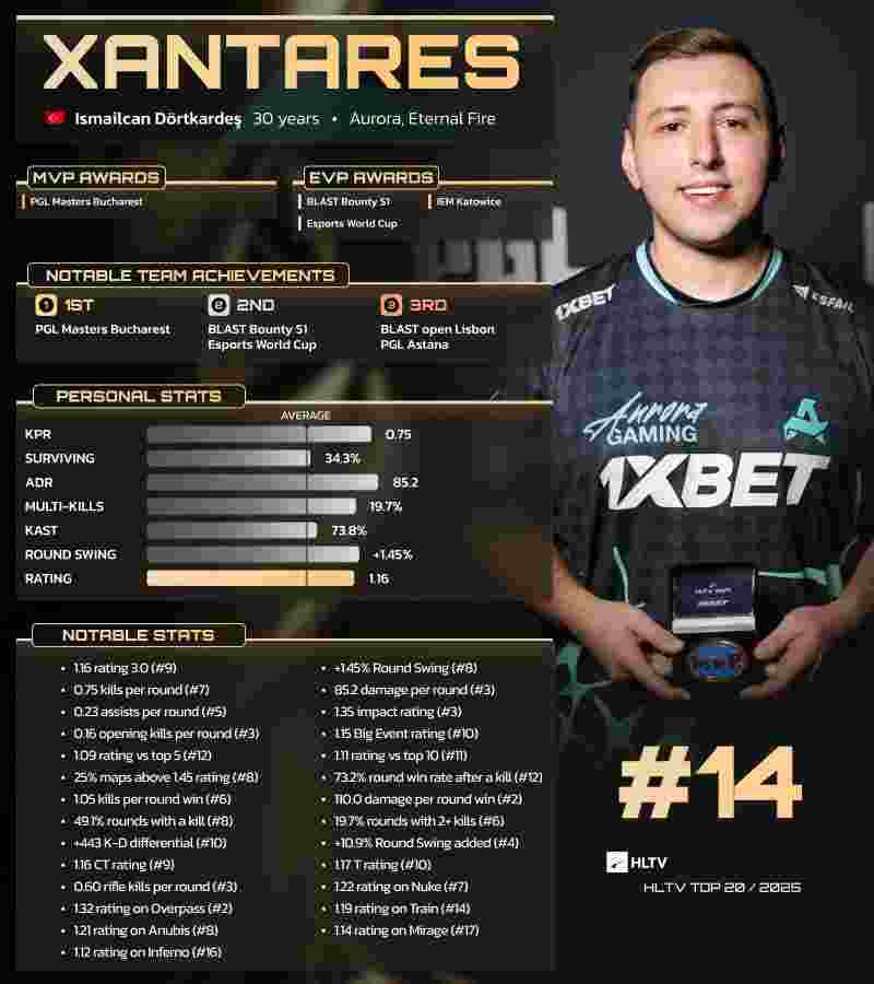 多年来,这位土耳其步枪手在许多人眼中一直是赛场上的明星,一位天赋过人、集锦频出的“高光机器”。他在CS圈内的存在感如此强烈,以至于“XANTARES peek”已成为玩家社区中的通用术语。然而在很长一段时间里,XANTARES在竞技层面的成绩始终未能匹配其巨大的文化影响力。