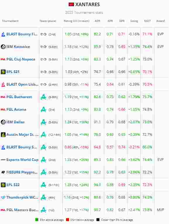 然而,队伍却在此刻全面崩盘。Aurora以13-11惊险拿下首张地图,XANTARES再次打出他标志性的单场100+ ADR表现,但随后连失两图,以一场溃败结束了整个赛季。XANTARES在前两张地图上表现尚可,但在决胜图中他打出了赛季最差比赛之一,以0.66的rating位列数据板末尾,目送队伍淘汰出局。