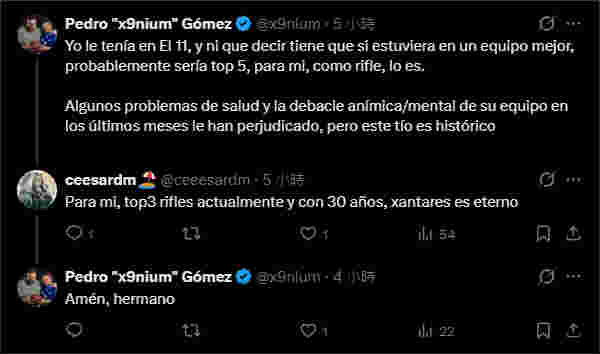 西班牙解说x9nium:我原本将他排在第11位。毋庸置疑,如果他效力于一支更好的队伍,很可能跻身前五。在我看来,单论步枪手能力,他已经是顶尖水平。近几个月的一些健康问题,加上队伍在士气/心态上的崩盘,确实影响了他的表现。但这位选手,绝对是传奇级的人物。