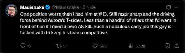 首先还是分析师Mauisnake:比我原先将他排在第13位低了一名。他依然锋利如刀,是Aurora战队进攻方的核心驱动力。若论需要有人用AK完成力挽狂澜的击杀,联盟中我只愿将少数几名步枪手排在他之前。他所肩负的、扛着队伍保持竞争力的重任,堪称艰巨。