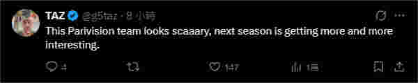 TaZ在其推文中写道:“这样一支PARIVISION让我们望而生畏,下一个赛季正变得愈发有趣。”