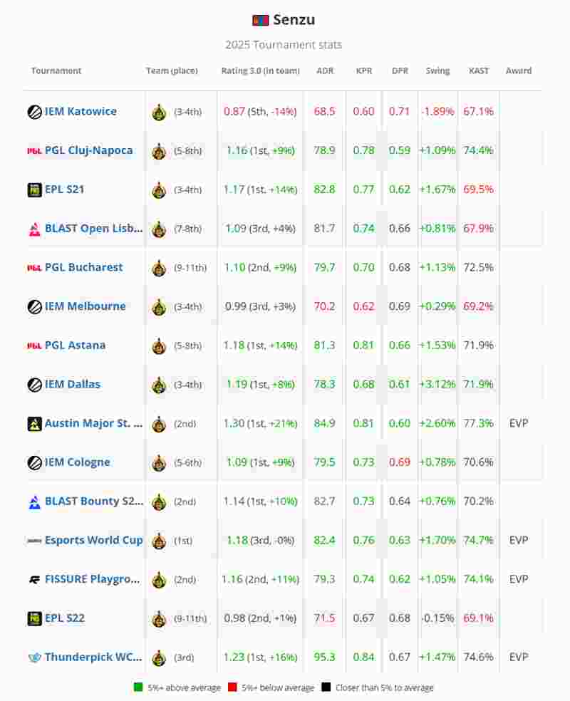 但Senzu的履历仍存在短板。他仅有一项来自精英赛事的EVP,对阵世界前五战队时rating仅为1.03,且在与TOP20选手的横向对比中,其平庸的淘汰赛数据随着榜单排名攀升更显劣势。这些因素共同导致他最终止步于第13名。