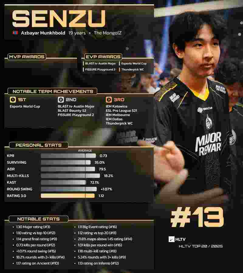 亚太地区此前虽有过入选TOP20的明星选手,如jks和HObbit,但Senzu的登榜对一个人口仅350万的国家而言具有独特意义。他是首位无需在欧洲或北美赛区效力即入选该榜单的亚洲选手,实现了自2016年Zilkenberg和Machinegun崭露头角以来,蒙古CS近十年的追求。