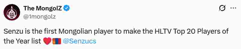 The MongolZ官推第一时间发出的感叹:“Senzu是首位跻身HLTV年度TOP20选手榜单的蒙古选手。”