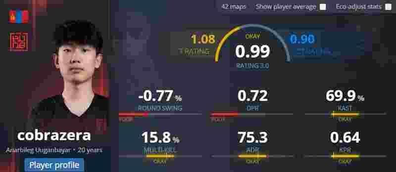 cobrazera有一个明显的成长过程。2024年刚加入Huns时,他全年0.99的rating实难让人说是优秀。虽然1.08的T方rating让他有不错的进攻性,但0.9的CT方rating让他作为主点人很容易被当作突破口。2024年的cobrazera在各项数据上都较为平庸,-0.77%的swing(回合影响)甚至低于平均值,这也间接导致Huns在2024年几乎颗粒无收。