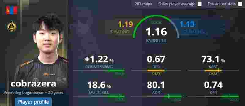 但2025年的cobrazera似乎被打通了“任督二脉”,全年rating暴涨至1.16,其中1.19的T方rating更是凸显了他强大的进攻能力。这一年的cobrazera以80.1的ADR(回合均伤)和0.74的KPR(回合击杀)成为队伍稳定的火力输出,其swing甚至从-0.77%跨越至+1.22%,产生了质的飞跃,帮助队伍一年揽获7冠5亚的好成绩(B、C级赛事),并在年底获得了参加布达佩斯Major的机会。