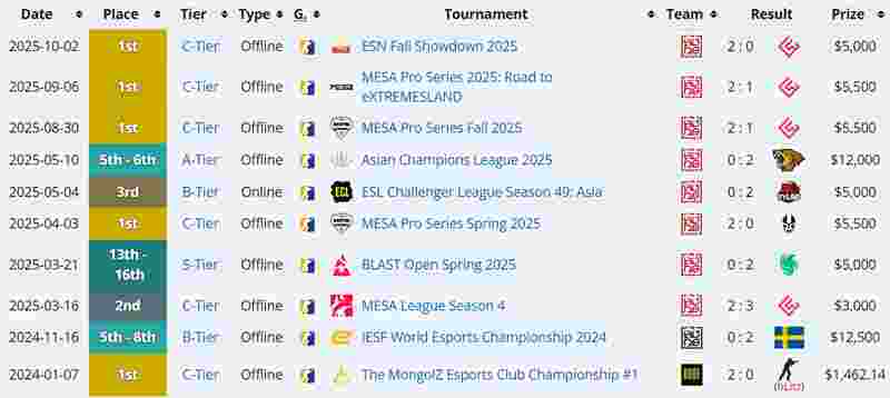 The Huns,期间拿到过ESN Fall Showdown 2025、MESA Pro春季赛等7次B、C级赛事冠军。且在年末随队参加了布达佩斯Major,虽仅止步第一阶段,但也展现出这位年轻小将的潜力。
