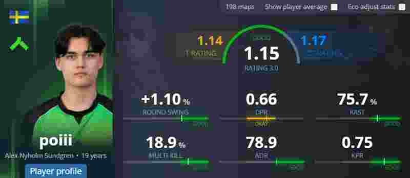 Alliance,这位瑞典小将开始正式展现自己的天赋。在这半年间,poiii状态迅速回暖,1.15的平均rating让他成为了队伍最稳定的火力点之一。其夸张的18.9%多杀回合比例(donk为25.5%,ZywOo为22.1%,m0NESY也仅有21.2%),搭配上75.7%的优秀不白给率,更是队伍破局的关键。在队仅半年便帮助队伍拿下了瑞典杯2025、游戏地带杯2025等4冠2亚(B、C级赛事)的成绩。甚至100T也曾为此子心动。
