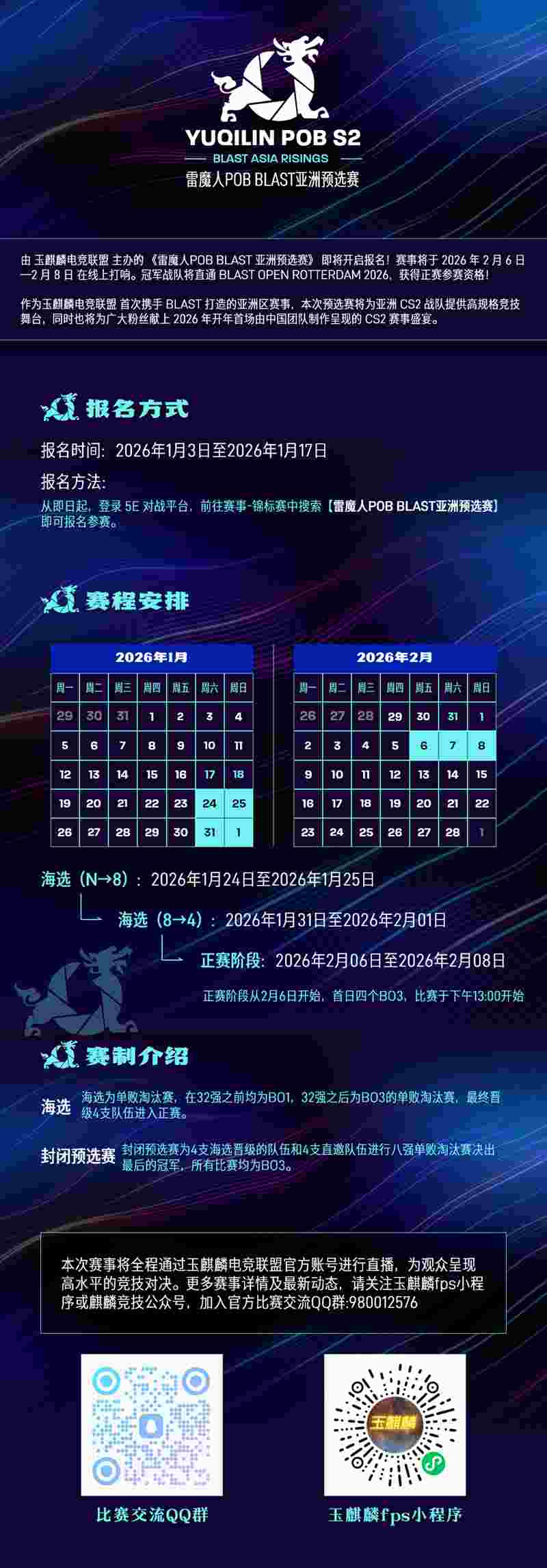 由玉麒麟电竞联盟主办的《YUQILIN POB S2-雷魔人POB BLAST 亚洲预选赛》报名正式开启!海选将于1月24日正式启动,封闭预选赛阶段将于2026年2月6日—2月8日在线上打响。冠军战队将直通BLAST OPEN ROTTERDAM 2026,获得正赛参赛资格!