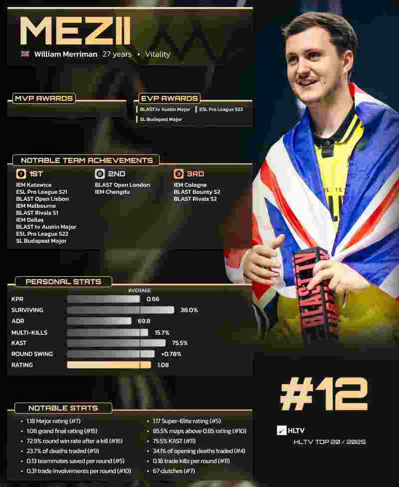 mezii在出色的2025赛季后,首次进入年度TOP20选手榜单。mezii在这一年诸多关键时刻挺身而出,在超级精英赛事中取得了平均1.17的Rating,并获得了三次EVP奖项,其中两次来自于Major赛事。