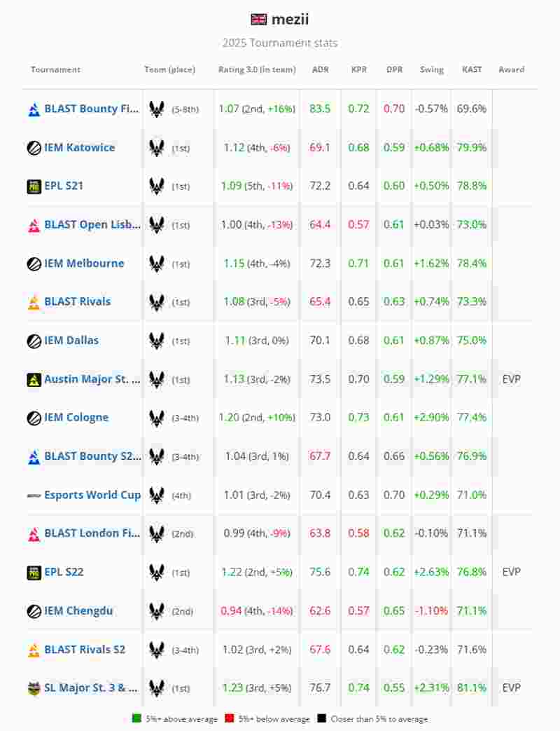 这两场Major决赛的出色表现,为他本就扎实的年度履历增添了最闪耀的一笔。mezii在两届由Valve赞助的Major赛事中整体Rating达到1.18(位列第7),在四项超级精英赛事中平均Rating为1.17(位列第5)。这位英国选手还在Vitality另外三场总决赛中贡献卓越,包括两届ESL职业联赛、IEM达拉斯站以及BLAST对抗赛的总决赛日,他在惊人的42张地图中交出平均1.08的总决赛Rating(位列第15),进一步巩固了他的排名。