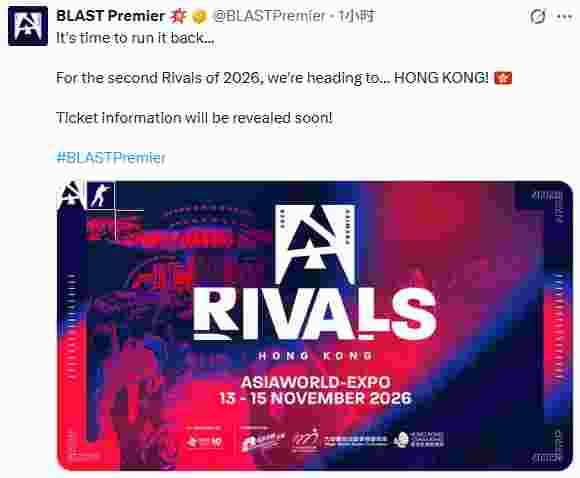 电竞赛事主办方BLAST近日宣布,2026年BLAST对抗赛S2将于11月8日至15日重返香港举行,其中最后三天的比赛将在亚洲国际博览馆进行。