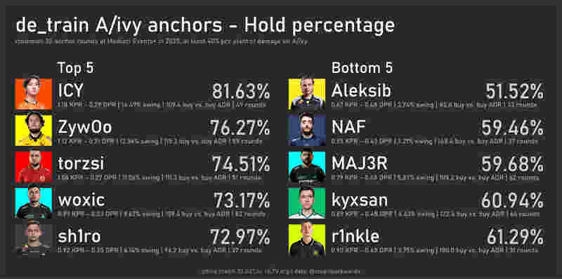 Virtus.pro的ICY,在经典地图Train上负责防守绿通,其惊人的81.63% 正效率冠绝榜单,而凭借地形优势,即便是统计名单中表现不甚理想的选手,防守成功率也能达到50%以上,可以说是真正意义上的易守难攻。