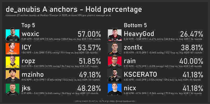 知名分析师btrams在其个人社交媒体上发布了一项针对性分析,基于具体数据评选出在Mirage、Inferno、Train和Anubis四张地图上表现最优异的辅助/点位防守选手。