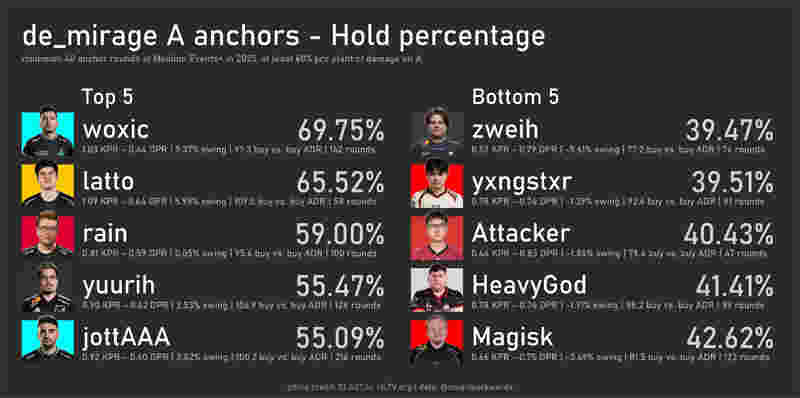 Aurora战队的woxic在Mirage的A点和Anubis的A点(或关键防守区域)表现最为突出,其战队在该点位取得优势的概率分别高达69.75%和57%,反观前