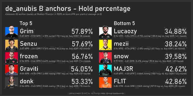 在anubis的B点防守上,mezii则几乎成为突破口,而表现最好的Grim和Senzu都拿到接近58%的正效率。