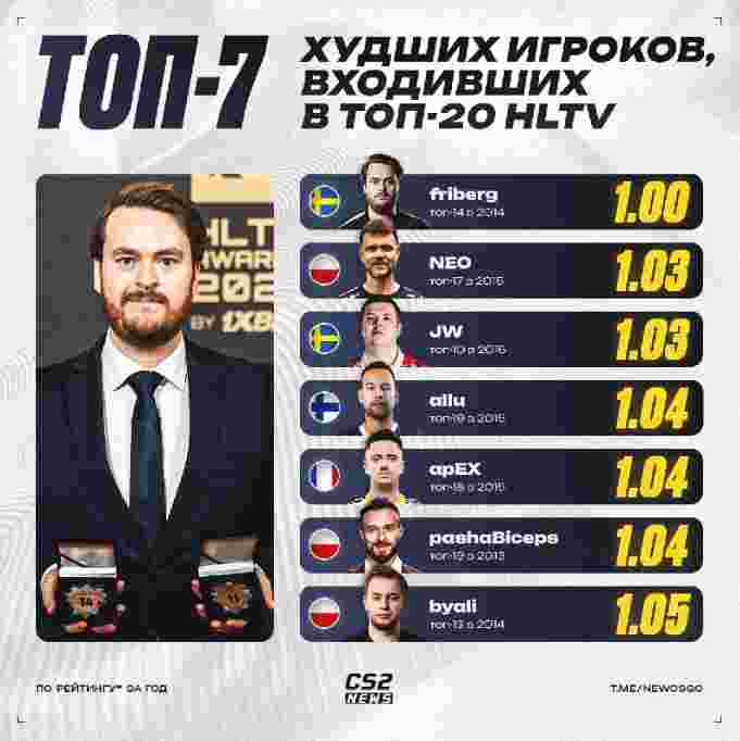 进入TOP20所需最低评分的是2014年的friberg,仅1.00 rating,并在ESL One科隆Major上获得MVP。最高的则是2024年度TOP1的donk,以1.36全年平均rating登顶第一。