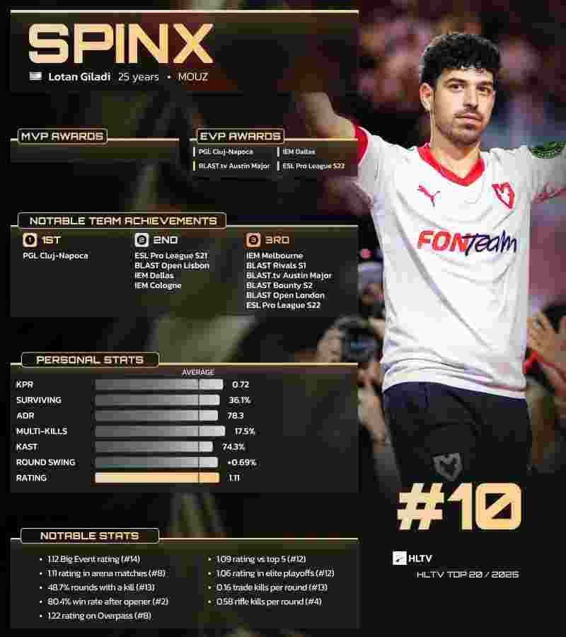 Spinx凭借其贯穿全年的稳定表现,在HLTV年度选手排行榜中位列第十。尽管错过了2025年四大顶级赛事之一的IEM卡托维兹,但他稳定的发挥足以弥补这一缺席。这是他继2023年获得第五名(当时他作为关键成员助