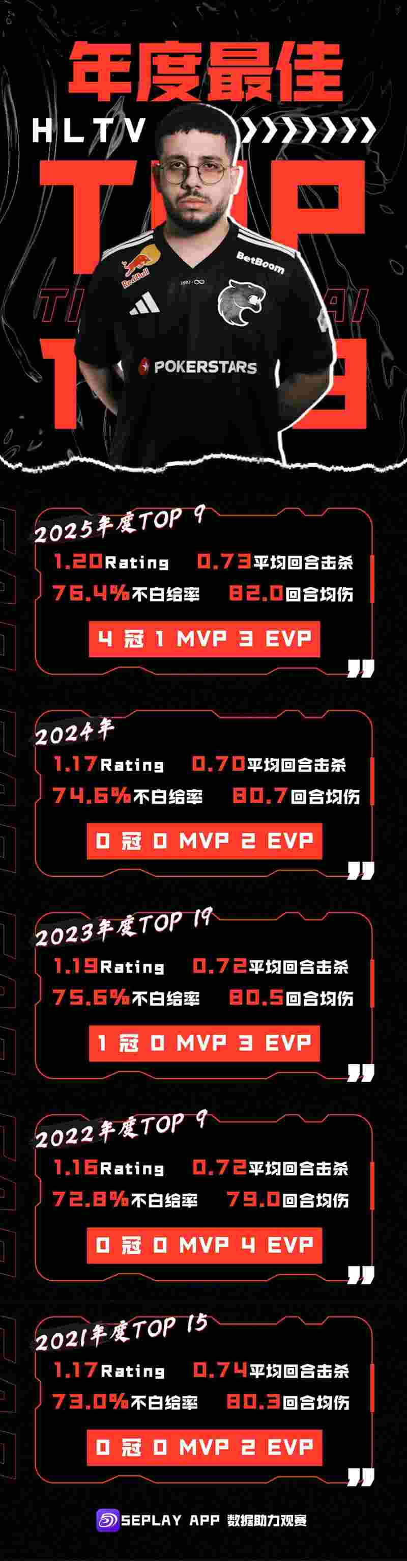 KSCERATO荣获了HLTV在今日凌晨公布的2025年度最佳选手第九位。这是他继2023年后再一次进入TOP20行列,并追平了他生涯最高排名。