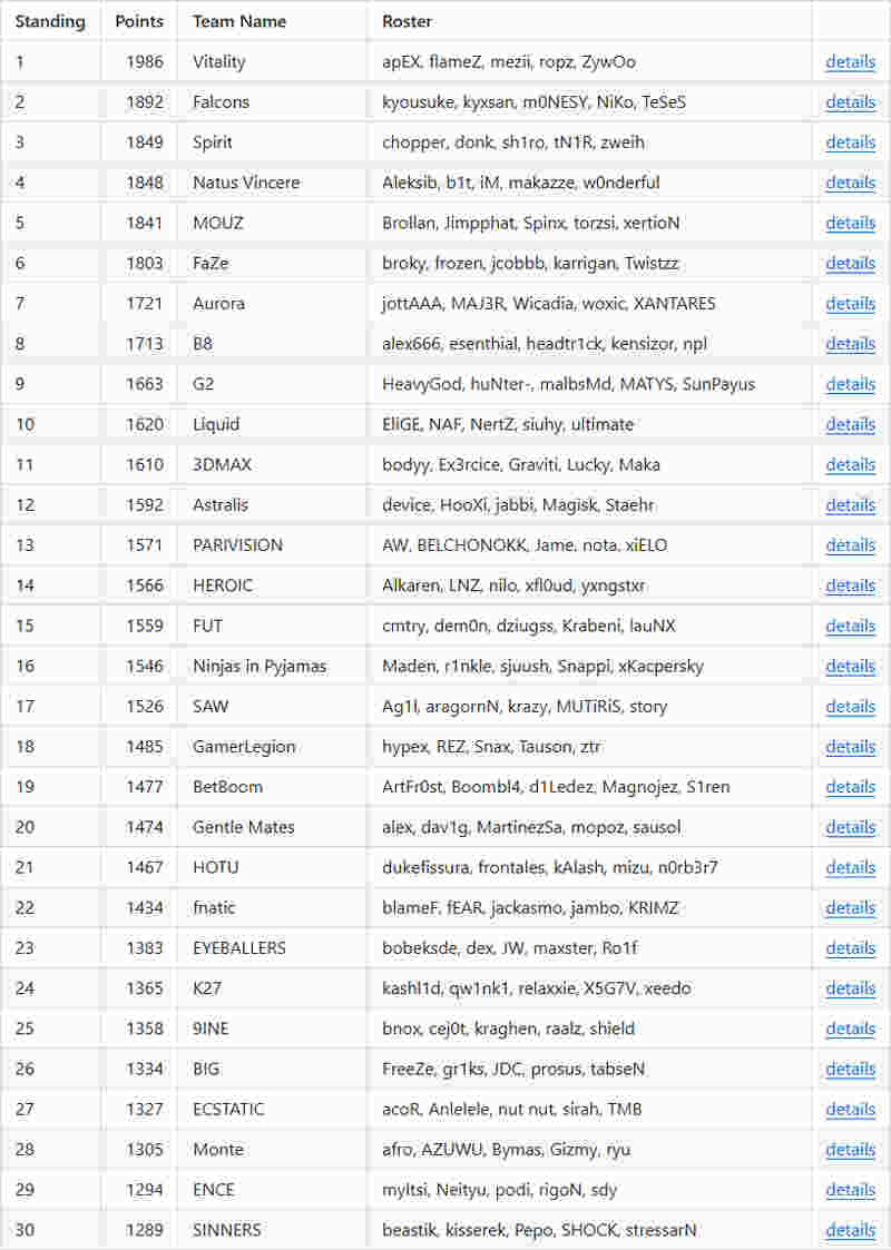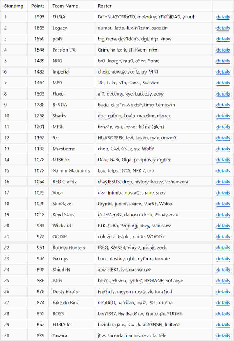 FURIA在上个月的布达佩斯Major止步八强,积分也从2001下降到1995,但凭借此前的积分领先,依然稳坐榜首的位置。第二名则是在此次Major夺冠的