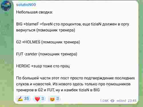 昨晚,爆料人solutioN00在电报进行了一系列的爆料和证实,其中包含BIG近期的变动以及G2、FUT助理教练的变动。以下为爆料内容:
