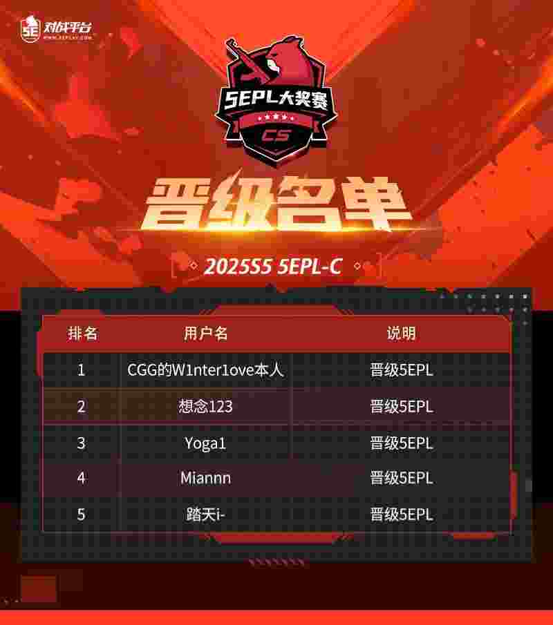2025S5 5EPL-C赛事已于1月8日6:00正式完赛,现对本次5EPL-C结算时排名前五的选手进行公示,公示期之后确认无违规行为的,将获得下一届5EPL大奖赛的资格(名额采用顺延原则)。