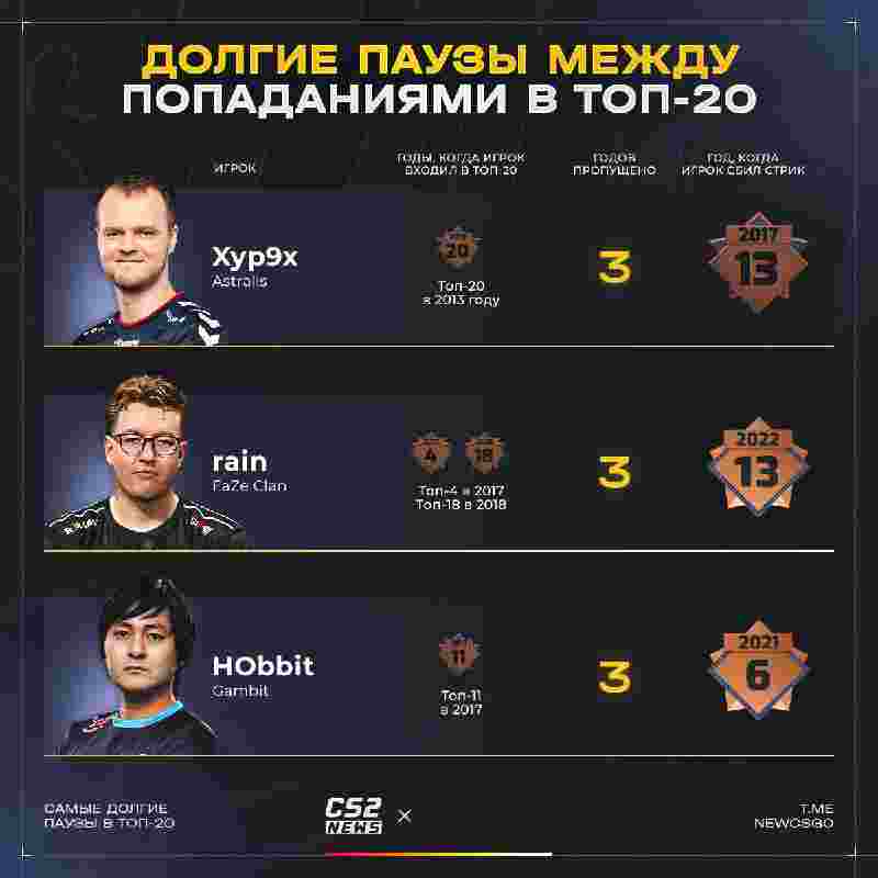 根据HLTV年度TOP20排名来看,CS历史上只有三位选手能够在无缘TOP20三年后,重新进入TOP20行列,他们分别是Xyp9x、rain和HObbit。