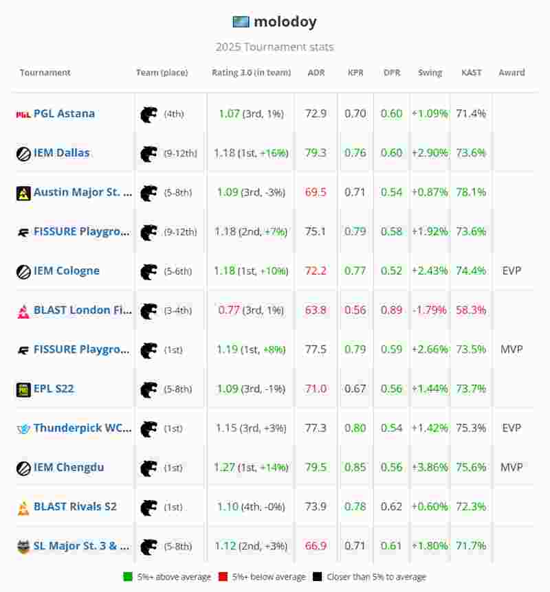 molodoy本次赛事表现稳定但缺乏往常的巨星锋芒,最终以1.10的平均rating(队内第四)结束征程。他在获胜地图中仅取得1.06的rating,这也使他与个人年度第三个EVP奖项失之交臂。