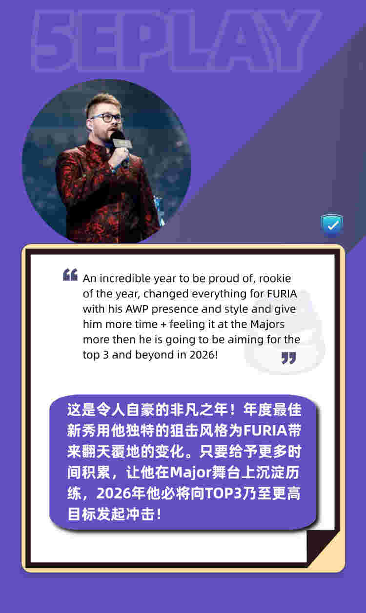 FURIA战队超级新秀molodoy在今日凌晨HLTV发布的年度TOP20榜单位列第六,知名主持人Banks认为他在未来能达到更高点。