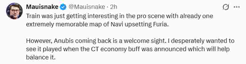 Mauisnake:“确实,职业赛场上Train刚打出点意思,比如NAVI爆冷击败FURIA的那场经典对局就让人印象深刻。不过Anubis回归终究是件好事。当初CT经济加强的公告一出,我就特别想看这张地图在新机制下的表现,相信经济调整能改善它的攻守平衡问题。”