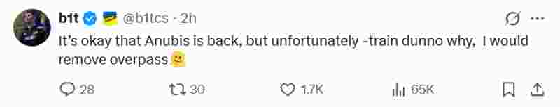 b1t:“没关系,Anubis回来了,但可惜的是Train没了,我会选择移除Overpass。”