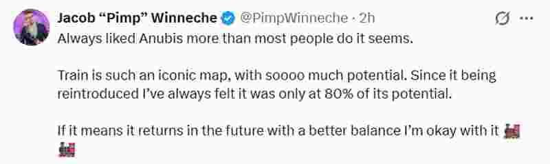 Pimp:“我似乎一直比大多数人更喜欢Anubis这张图。Train是一张极具标志性的地图,潜力巨大。自它回归以来,我总觉得它只发挥了80%的潜力。如果这次调整意味着未来它能以更平衡的姿态回归,那我完全可以接受。”