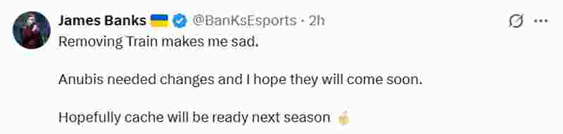 BanKs:“移除Train这张地图让我感到有些难过。Anubis这张图确实需要调整,希望改动能尽快到来。但愿下一赛季能看到Cache以更完善的姿态回归。”