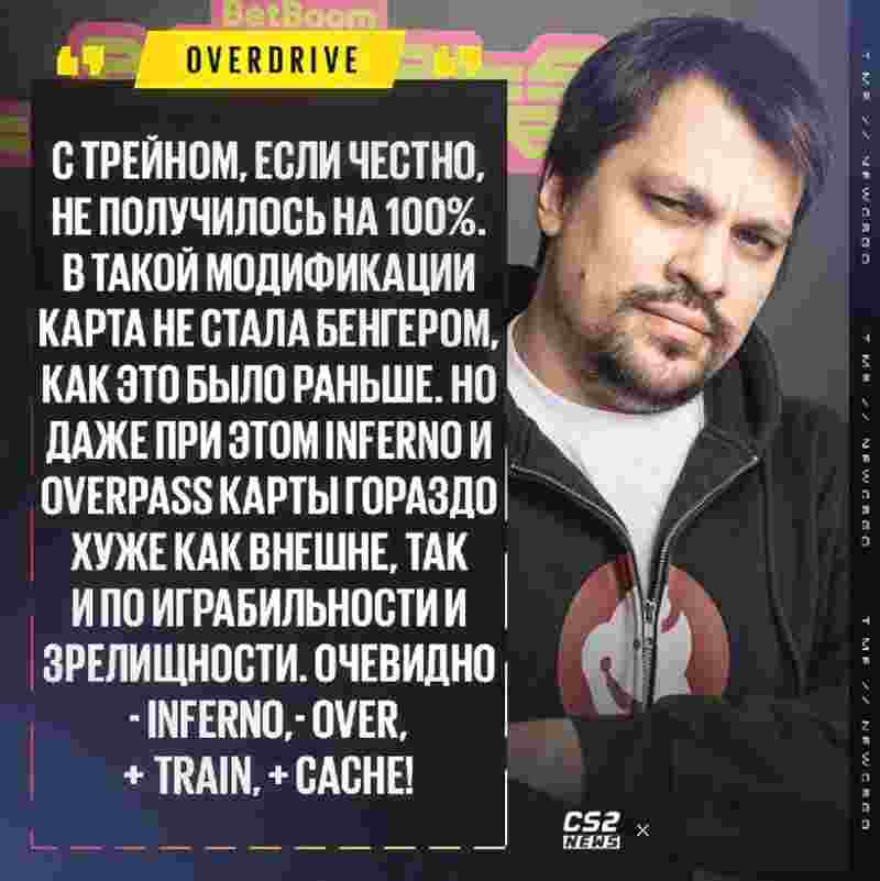 OverDrive:“说实话,Train这张图没做到100%成功。在这种修改下,这张图没能像以前那样成为热门地图。但即使如此,Inferno和Overpass这两张图,无论从视觉效果、游戏性还是观赏性来说,都要糟糕得多。应该移除Inferno和Overpass,加入Train和Cache。”