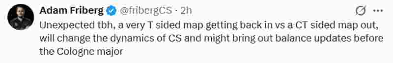 friberg:“说实话挺意外的,一张偏进攻方的图回归,换掉的却是偏防守方的图,这可能会改变CS的战术格局,说不定在科隆Major前会迎来平衡性更新。”