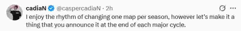 cadiaN:“我很喜欢每个赛季更换一张地图的节奏,但希望你们能在每届Major赛事周期结束后正式宣布这一变更。”