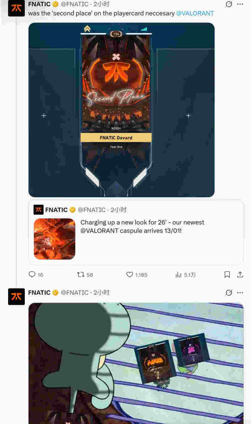 2026 VCT战队标配将于1月14日上线,FNC发文自我调侃:是不是得在FNC的卡面加上“第二名”的字眼呀?