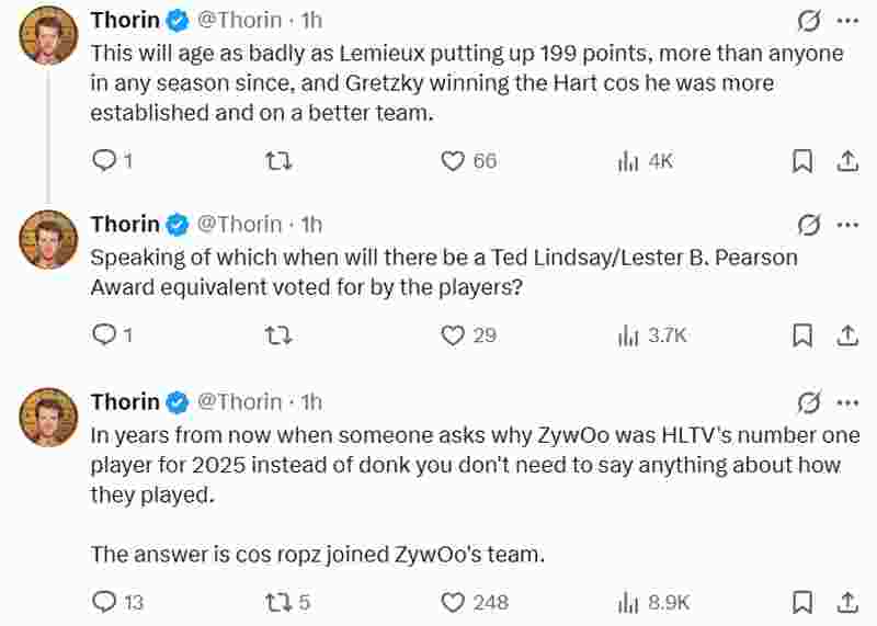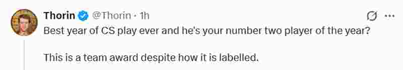 著名“载黑”Thorin对于年度最佳选手的评选更是不满,连续发推:“他打出了CS生涯中最好的一年,结果却只被评为年度TOP2选手?这本质上是个团队奖项,尽管名头上标榜个人荣誉。”