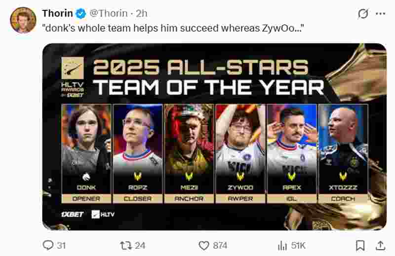 “等将来有人问起,为什么2025年HLTV年度第一选手是ZywOo而不是donk,你根本不需要分析他们的赛场表现。答案只有一个:因为ropz加入了ZywOo的队伍。”
