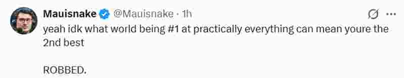 Mauisnake则直接表达了自己的不满:“好吧,我真的不理解,一个几乎在所有方面都排名第一的选手,怎么就能被评为TOP2呢?这简直是黑幕!”