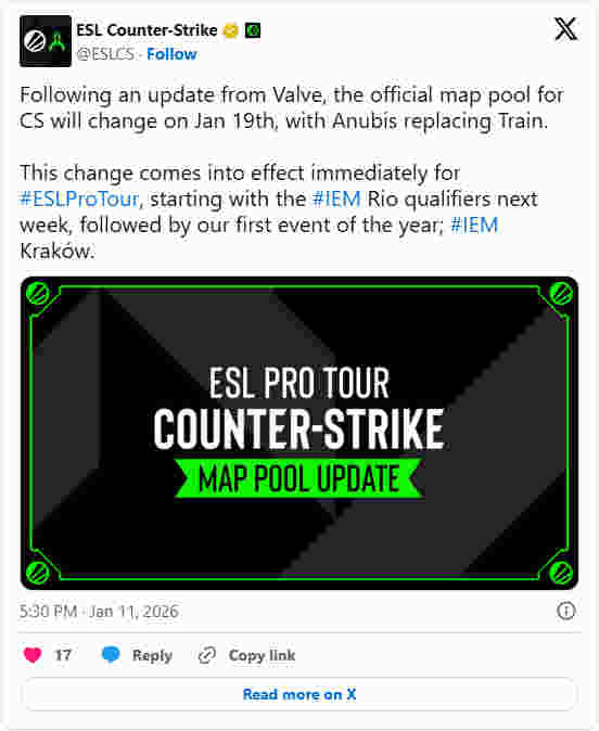 此次地图池变更是CS2 2026赛季初期的重要竞技环境调整。Anubis在经历六个月缺席后重返职业赛场——该地图曾于2025年秋季赛季初被移除,由Overpass替代。地图池的轮换直接影响各战队的战术储备、备战方向及赛事晋级路径,尤其对即将开赛的IEM克拉科夫2026及后续ESL相关赛事的备战策略产生直接冲击。
