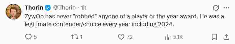 而Thorin在为donk感到遗憾之后,再次对ZywOo获得TOP1一事发出不谐之音:“当考虑到这正是他们声称NER0去年为否定ZywOo第二名而编造的理由时,ZywOo的狂热粉丝们赞同HLTV关于大赛数据的观点真是可笑至极。ZywOo粉丝最令人惊讶的地方在于他们毫无立场可言。这甚至不是对错的问题,而是他们根本毫无原则。他们总是等到数据出炉后,再挑选那些能让ZywOo显得最强的数据来说事。”