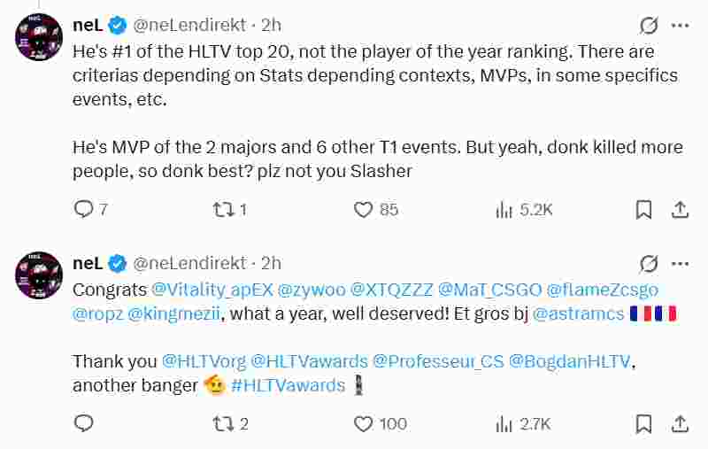 然后对质疑ZywOo的评论进行了回击:“他是HLTV TOP20榜单的第一名,而非年度选手排名。这份榜单的评判标准取决于不同情境下的数据表现、MVP数量以及特定赛事中的发挥等因素。他获得了2届Major和6个其他T1级别赛事的MVP。但确实,如果只论击杀数,donk可能更胜一筹。难道仅凭这点就能认定donk是最强的吗?拜托,别来这套。”