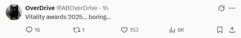 OverDrive则是对只有Vitality战队得奖感到无趣:“Vitality的2025颁奖典礼...无聊透顶...”
