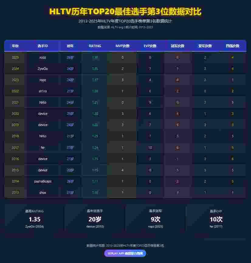 Astralis在2018年创下的历史记录。ropz也是继NiKo、device和s1mple之后第四位连续八年入选年度TOP20次数最多的选手。那么,从2013年至今,历史上每年TOP3的选手们数据又是如何?
