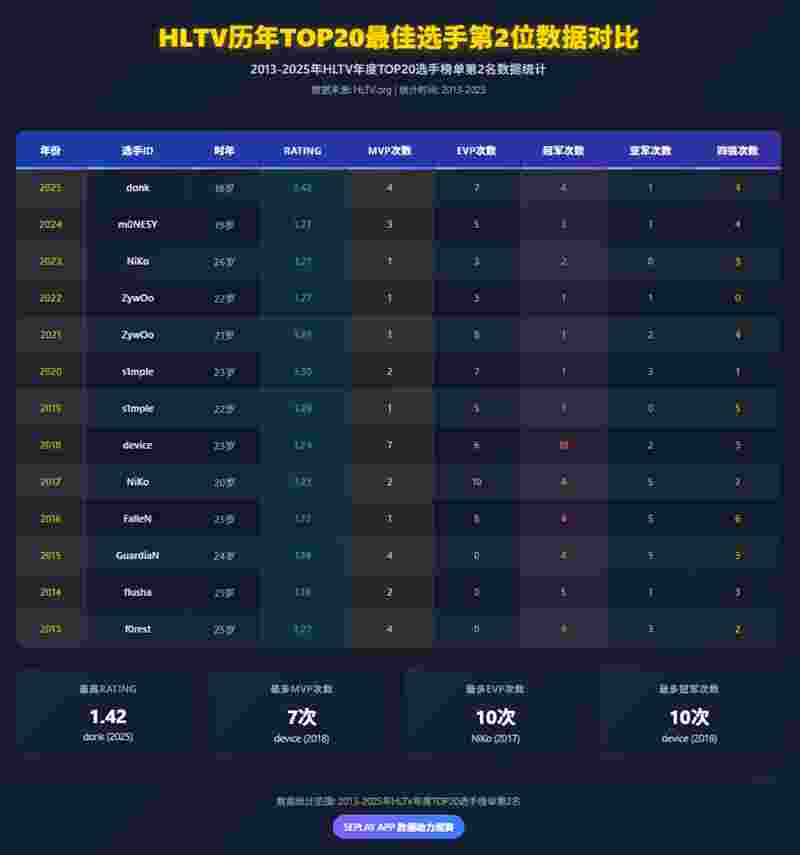 在历届TOP2的选手中,数据最为亮眼,且最为年轻的便是今年年仅18的donk了,1.42的rating在榜单上一骑绝尘,没有任何选手能碰瓷,可谓是最强TOP2。2025年的donk虽然数据无敌,但他对此却并不满意。Spirit在上半年虽拿到了BLAST赏金赛S1、PGL阿斯塔纳2025在内的2冠1亚,但总体来说被正处王朝的