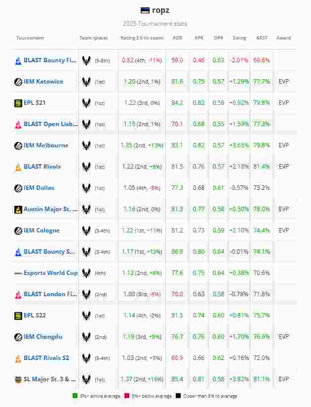 尽管他全年未能收获MVP奖项,但他在IEM墨尔本站和StarLadder布达佩斯Major的巅峰表现,足以媲美2025年许多选手的MVP级发挥。布达佩斯站的MVP争夺尤为激烈,若考量赛事重要性,ropz在该赛事的表现堪称全年除前两名外所有选手中的最佳。
