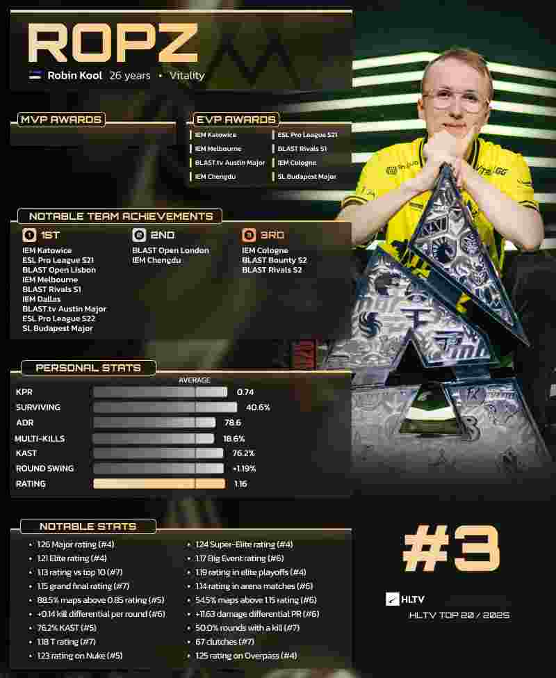 Vitality度过历史性成就的一年后,ropz重返HLTV TOP20选手排行榜领奖台,他在全部四场超级精英赛事中均获得了奖项。